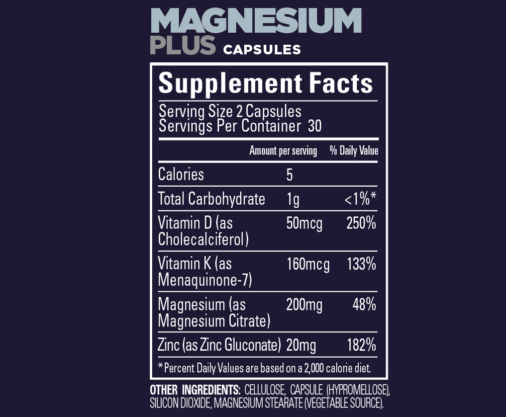 Οι κάψουλες GU Roctane Μagnesium Plus παρέχουν 200mg μαγνησίου στη δόση και είναι εμπλουτισμένες με 50mg βιταμίνης D και 160mg βιταμίνης Κ. Οι βιταμίνες D και Κ είναι εξαιρετικά σημαντικές για τους αθλητές αντοχής καθώς συνεργάζονται για την προώθηση της οστικής και καρδιαγγειακής υγείας.
