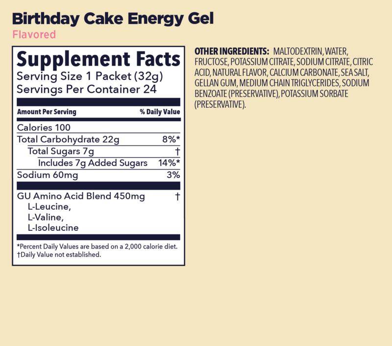 - Ηλεκτρολύτες: Κάθε GU Energy Gel περιέχει 50-60mg νάτριο, ανάλογα με την γεύση. Κάποιες γεύσεις έχουν ενισχυμένα επίπεδα ηλεκτρολυτών και το νάτριο φτάνει τα 125mg. Συνήθως αυτές οι γεύσεις είναι οι αλατισμένες (salted).