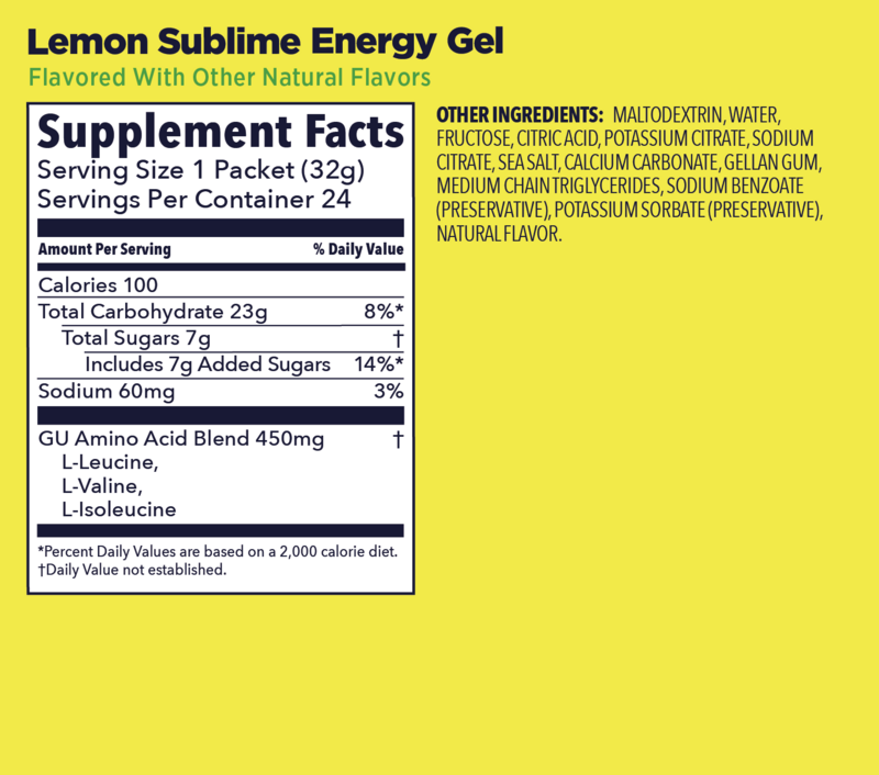 Το GU Energy Gel είναι μια συμπυκνωμένη μορφή υδατανθράκων σε μορφή gel, που εκτός από υδατάνθρακες, περιέχει βιταμίνες, αμινοξέα, ανόργανα στοιχεία και μίγμα βοτάνων. Είναι σε μικρή, ατομική και εύκολη στην μεταφορά συσκευασία 32 γραμμαρίων.